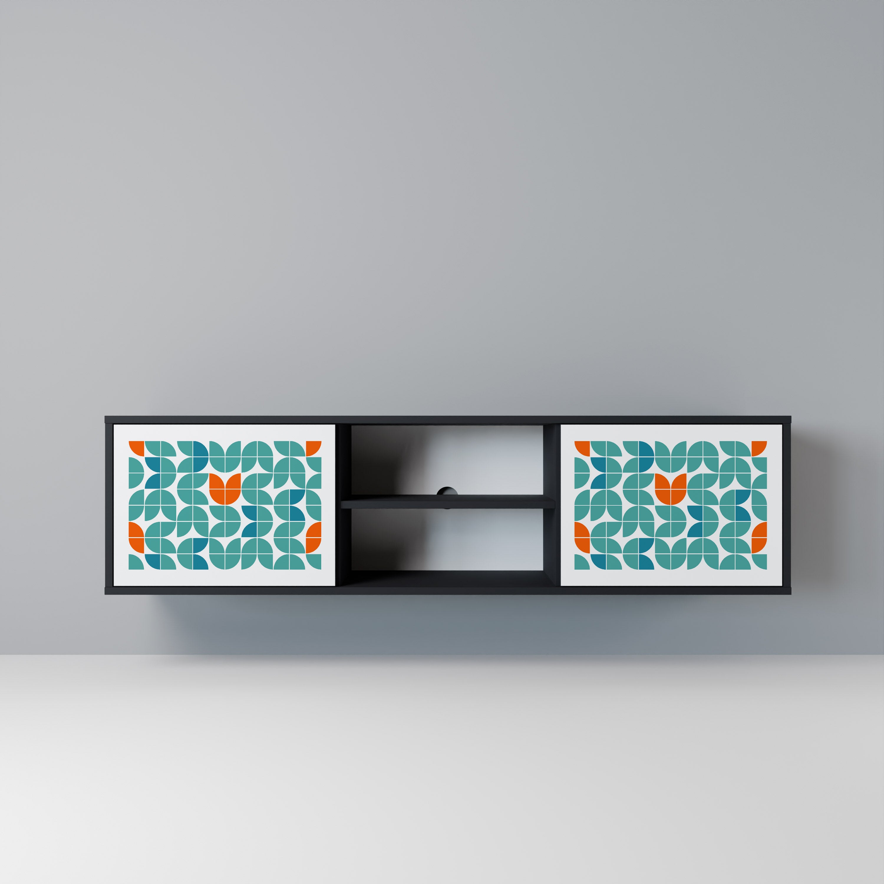 Mueble de TV de 2 puertas con combinación floral en acabado negro Mueble de TV de 2 puertas con combinación floral en acabado negro