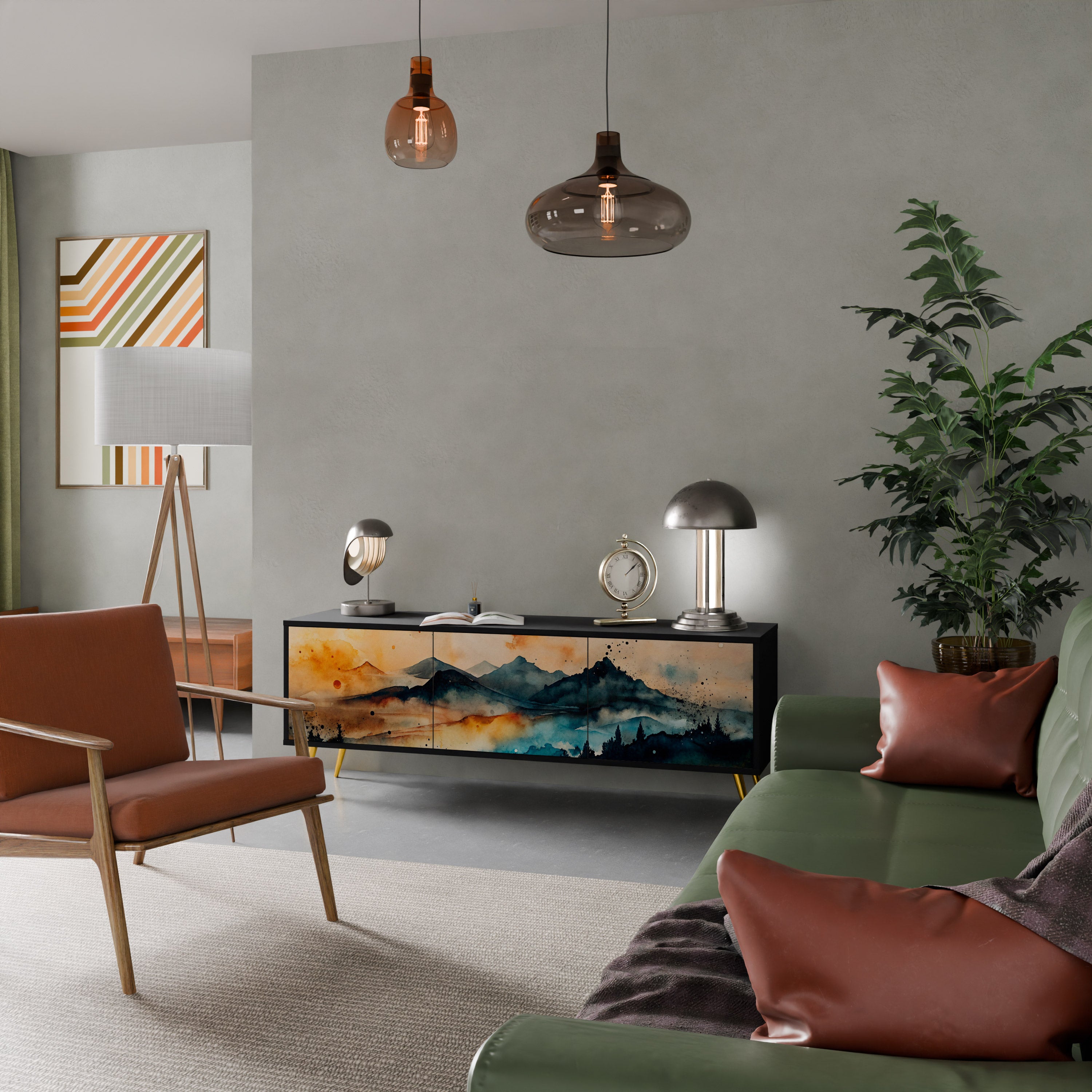 Mueble de TV de 3 puertas OMINOUS MOUNTAINS con acabado negro Mueble de TV de 3 puertas OMINOUS MOUNTAINS con acabado negro