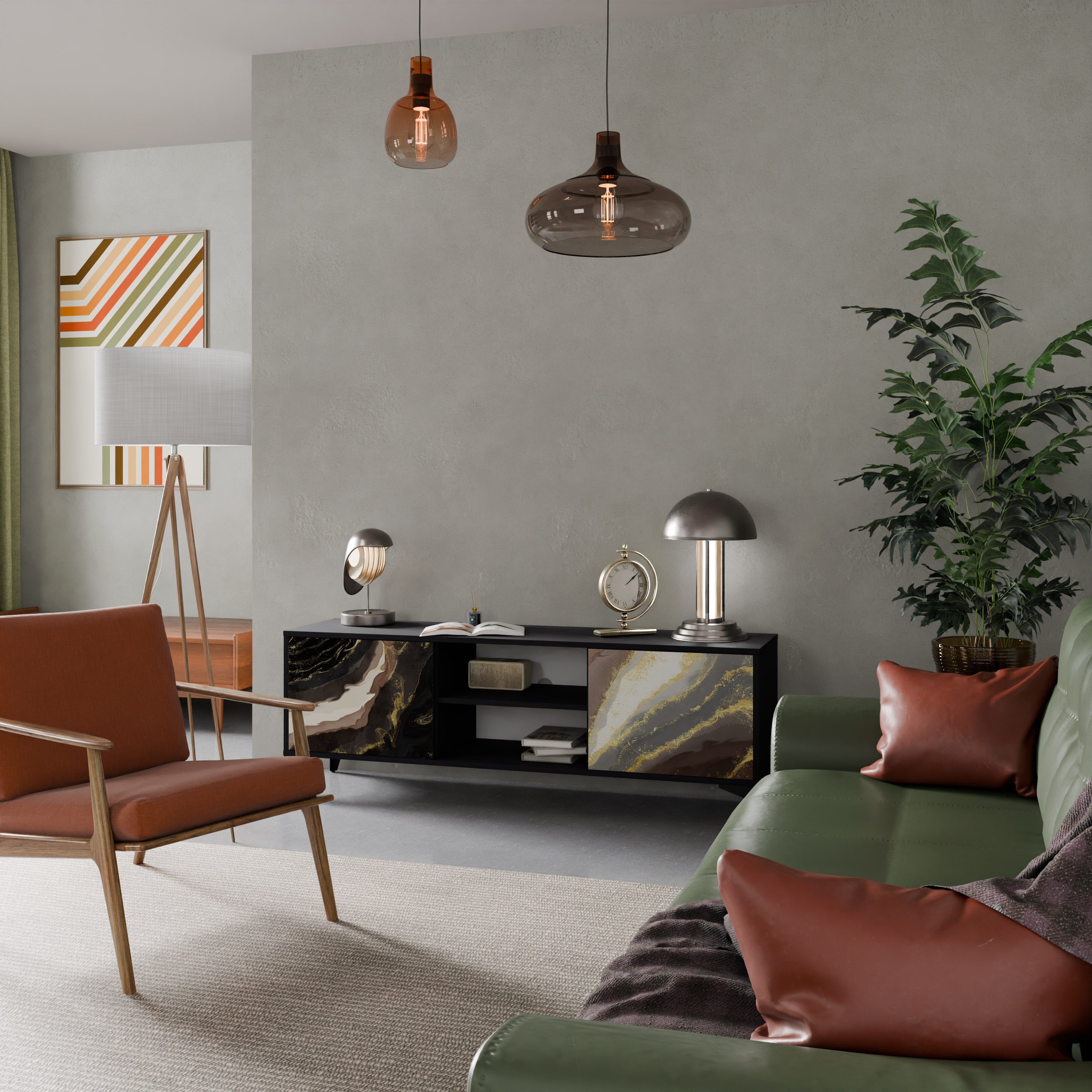 The black body gives the TV stand an elegant, modern look, while the fronts with an exceptional print draw attention, making it the focal point of any room. The spacious interior provides room for electronic devices, cables, remotes, and other accessories, helping you maintain order and organization.