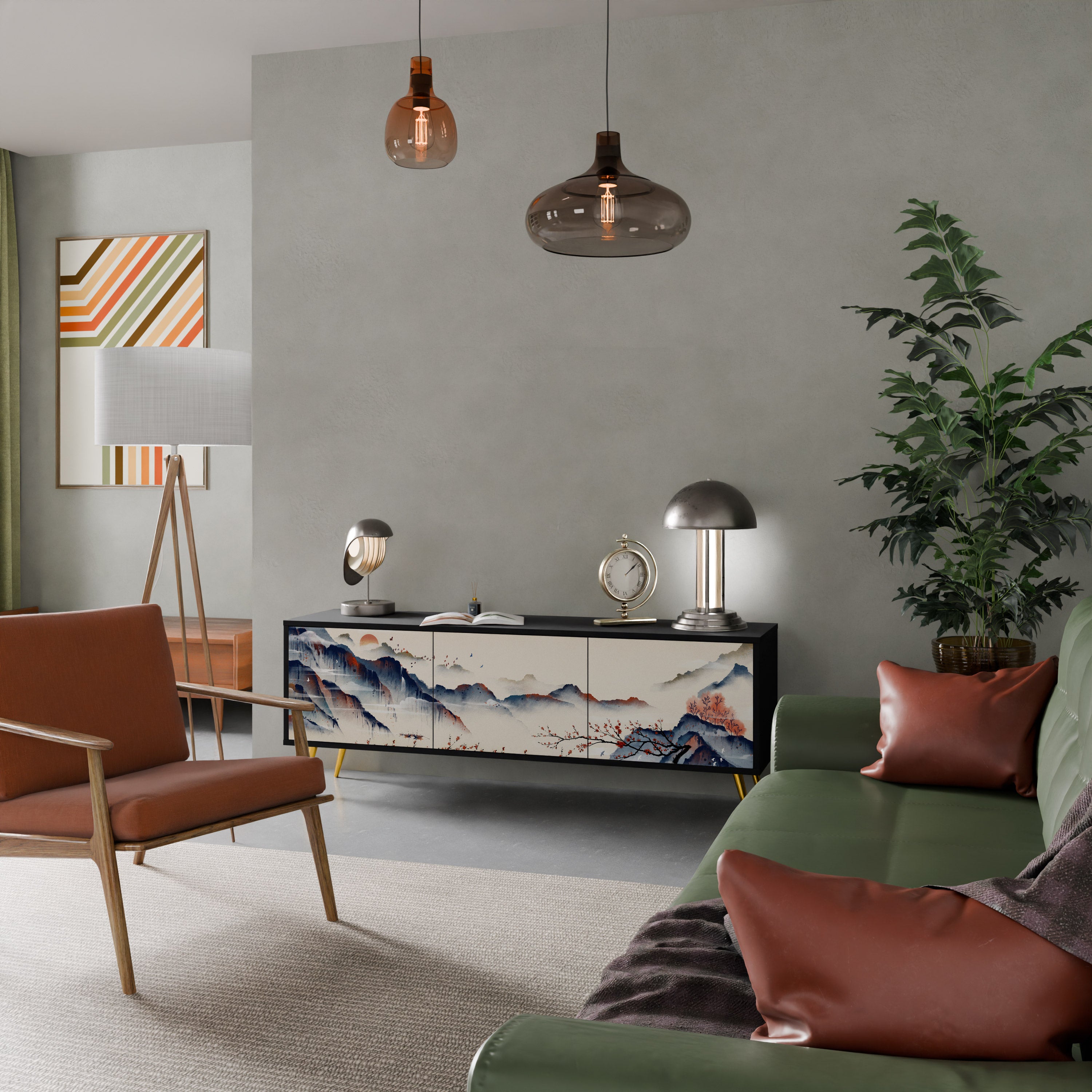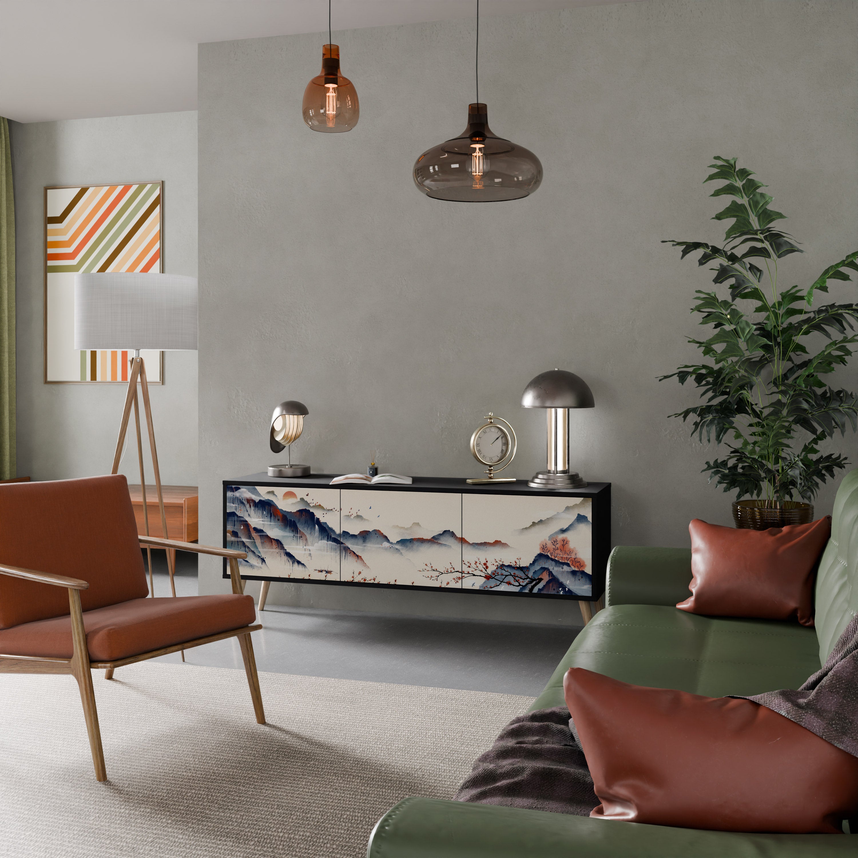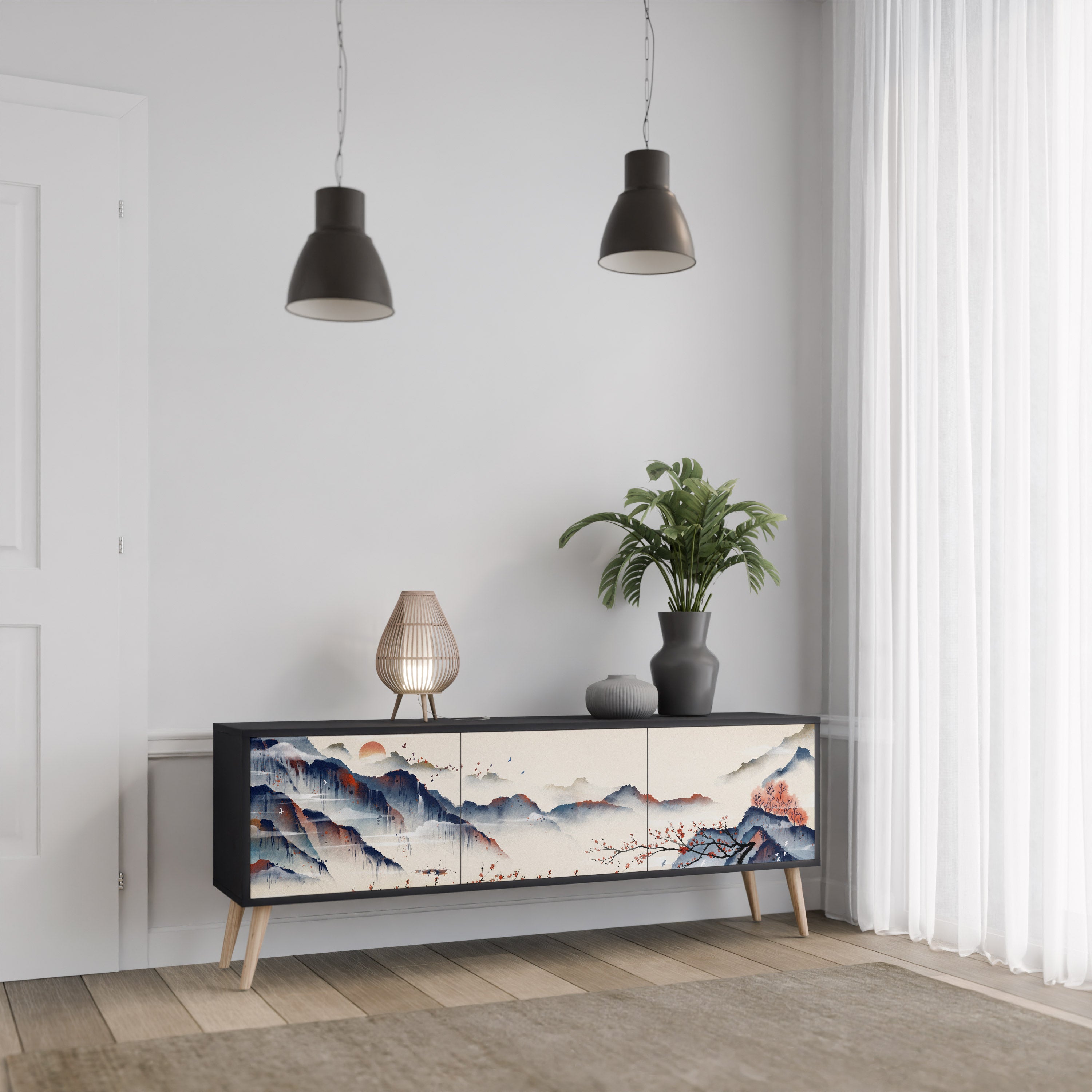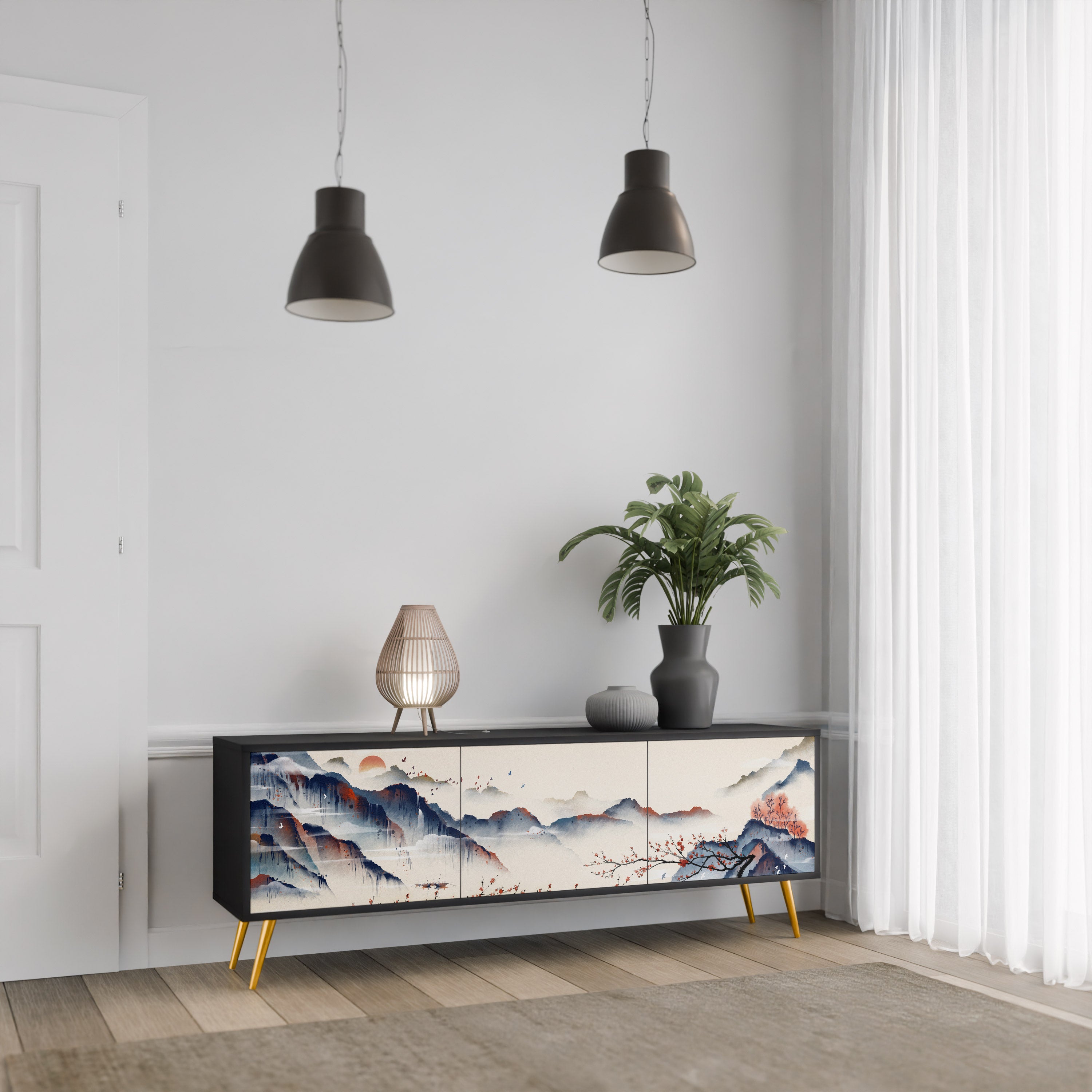 JAPANESE LANDSCAPE 3-Door TV Stand in Black Finish