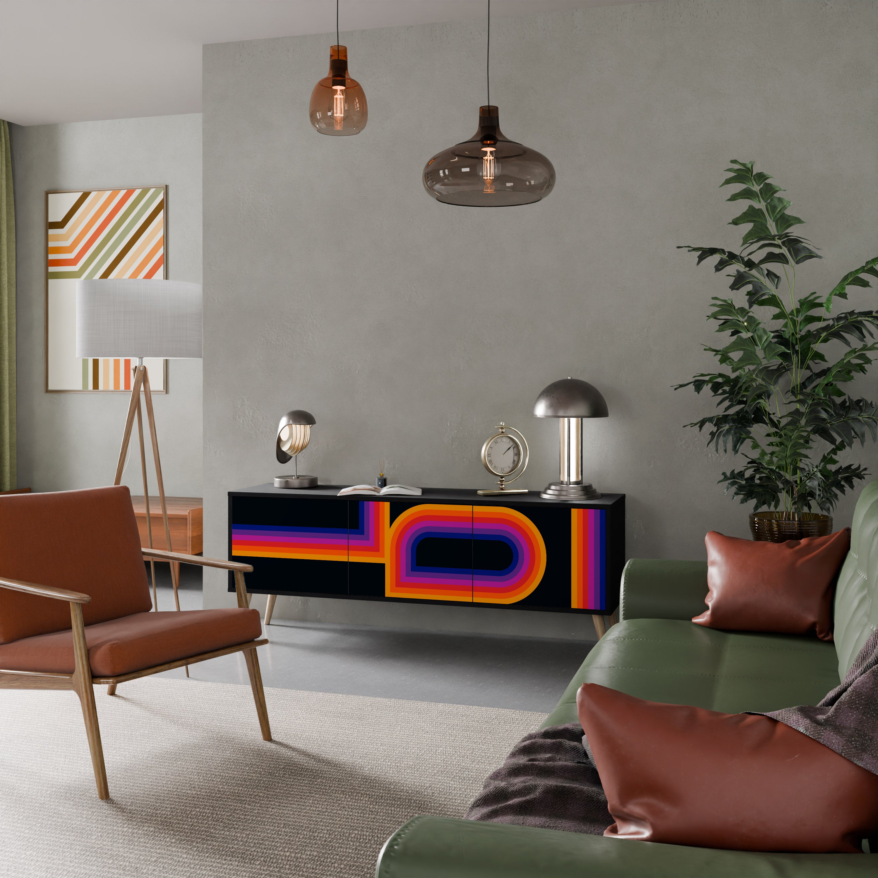 El cuerpo negro del soporte crea un toque moderno y audaz que combina a la perfección con ambientes industriales y minimalistas. Los frentes con estampado de diseño aportan carácter y singularidad, convirtiendo esta pieza no solo en práctica, sino también en un elemento decorativo destacado.