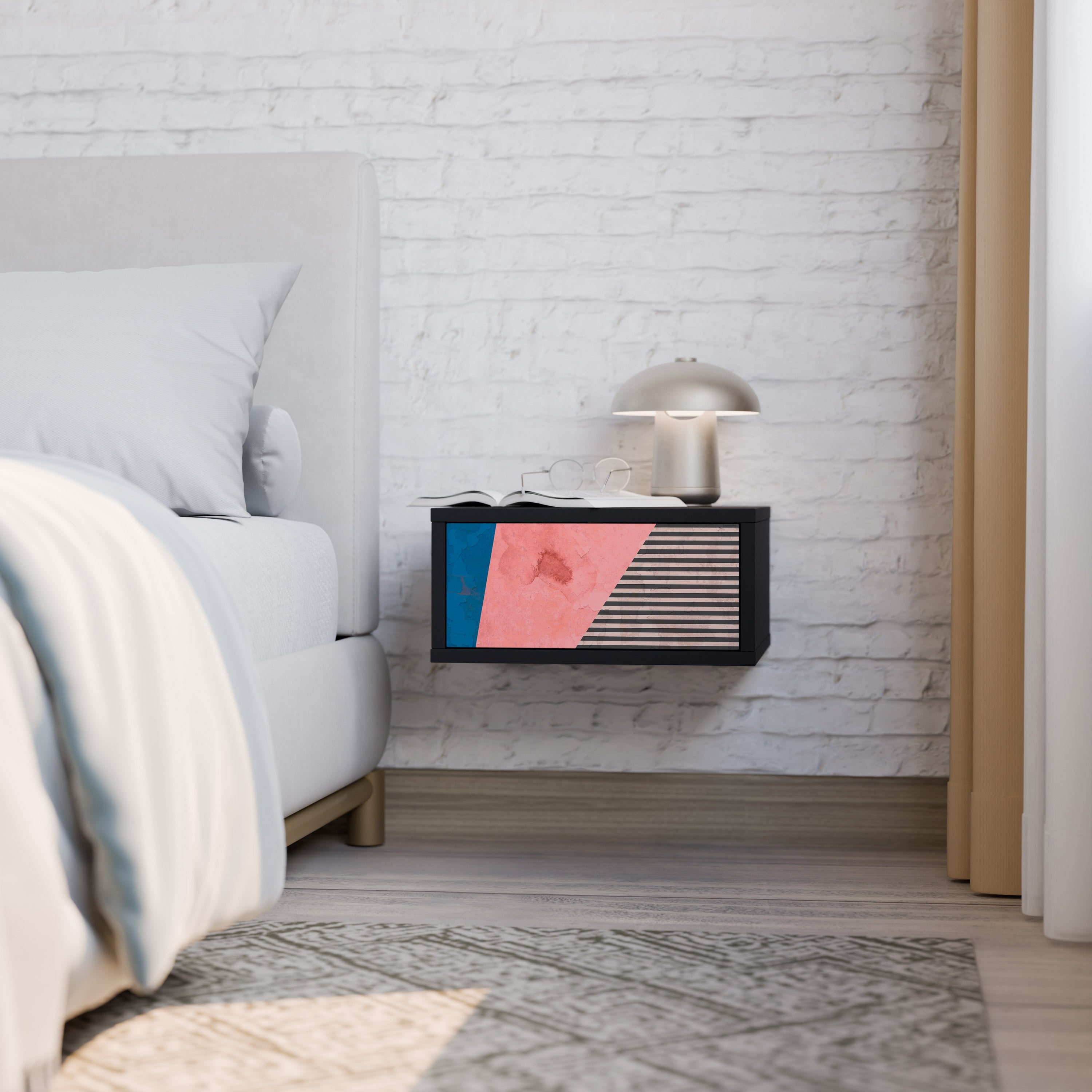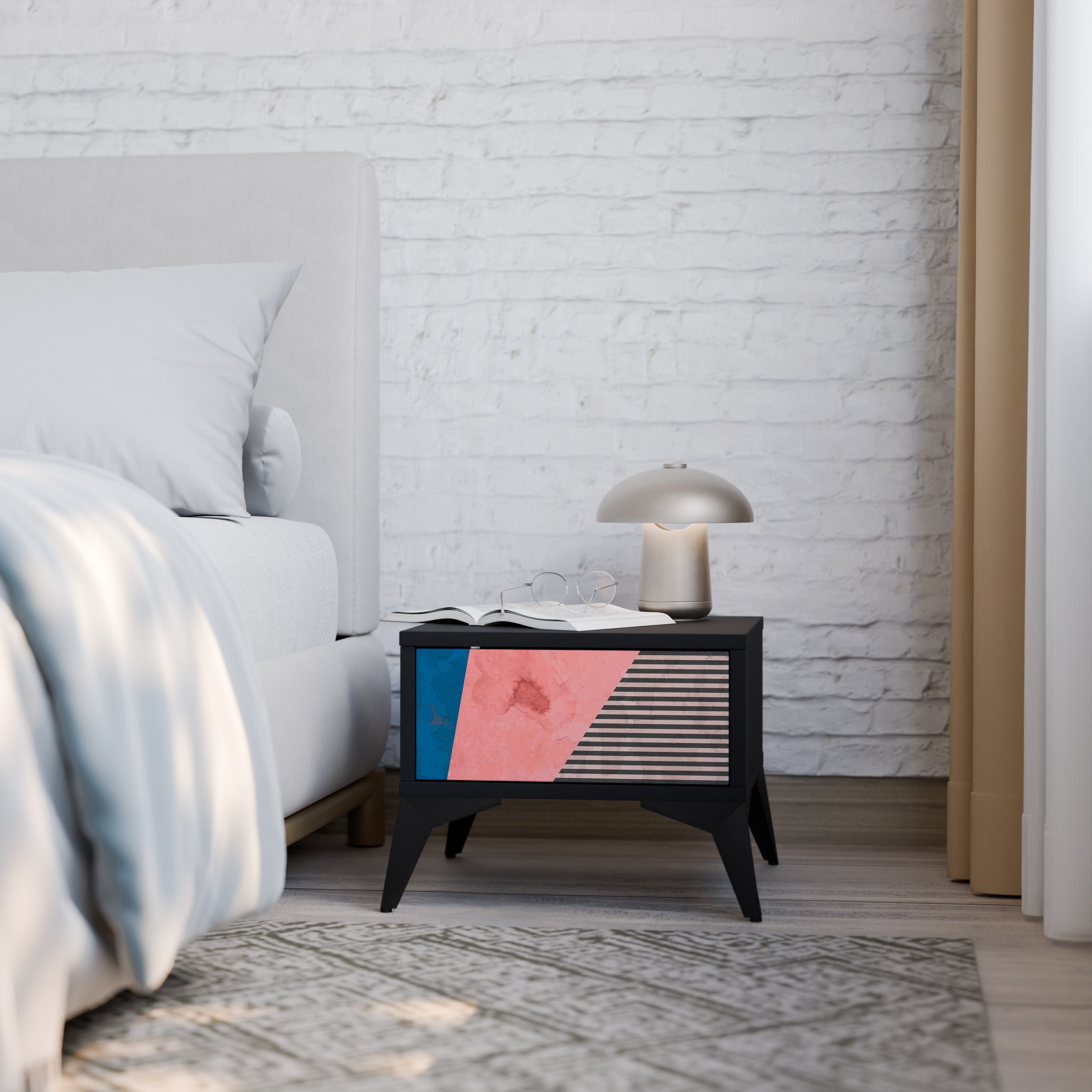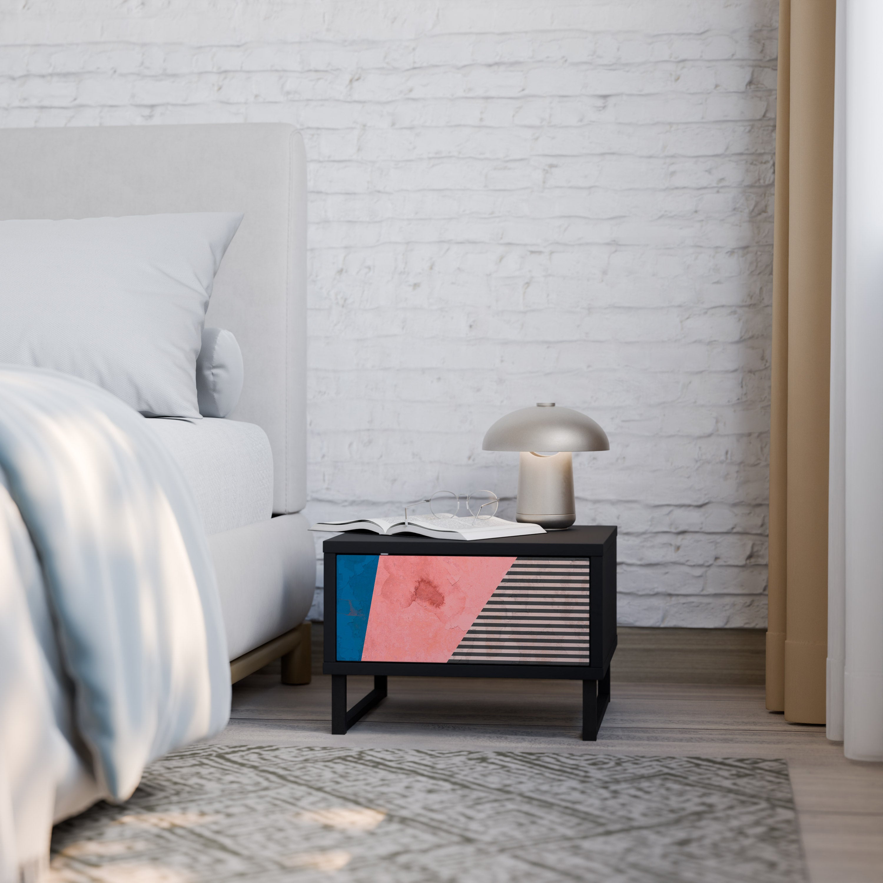 El mueble está cuidadosamente diseñado para ayudarte a mantenerte organizado. El espacioso cajón ofrece el espacio ideal para guardar pequeños artículos esenciales como cosméticos, cargadores o accesorios, mientras que la generosa superficie superior ofrece espacio para una lámpara de noche, un libro o un teléfono, para que tengas todo lo que necesitas siempre a mano.