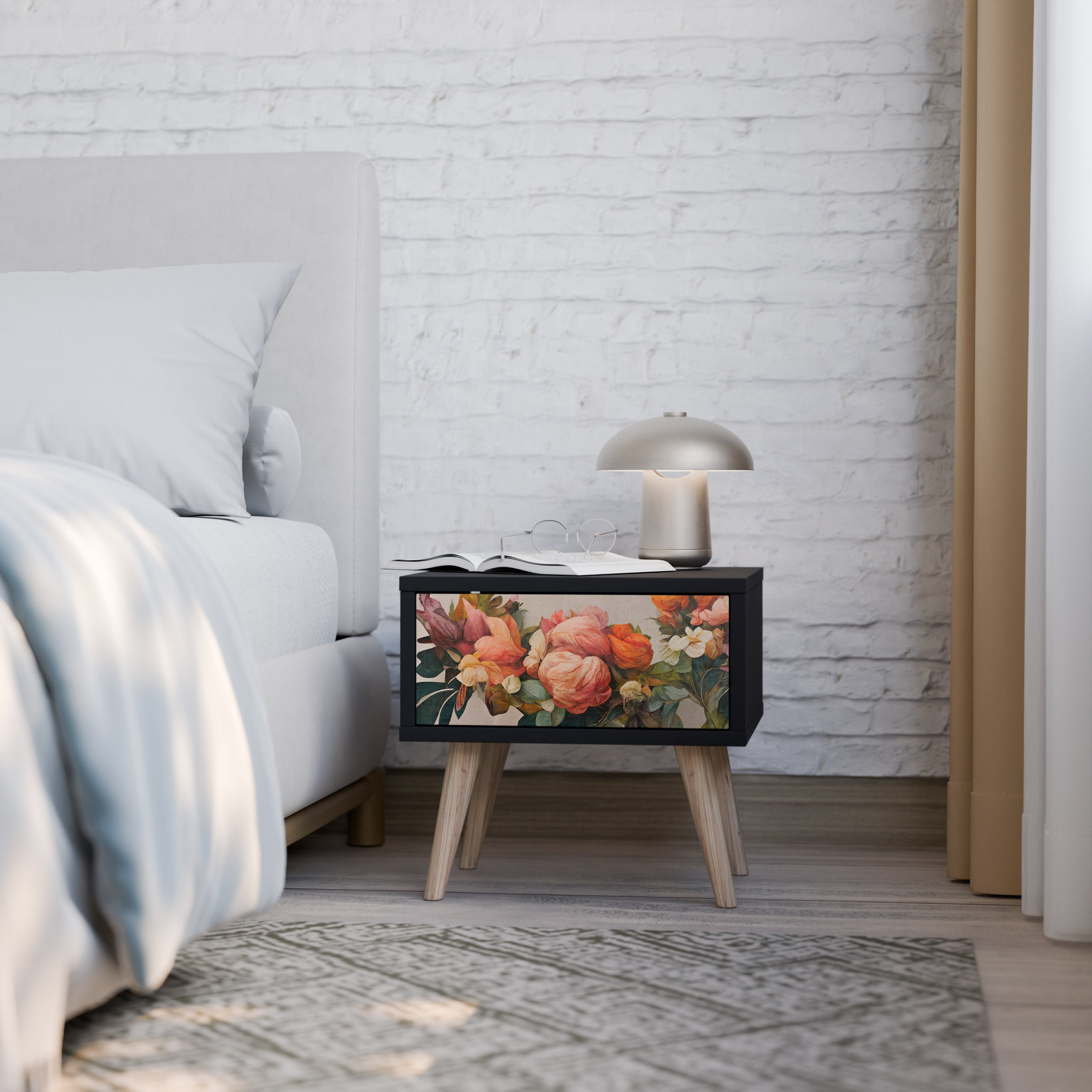 El mueble está cuidadosamente diseñado para ayudarte a mantenerte organizado. El espacioso cajón ofrece el espacio ideal para guardar pequeños artículos esenciales como cosméticos, cargadores o accesorios, mientras que la generosa superficie superior ofrece espacio para una lámpara de noche, un libro o un teléfono, para que tengas todo lo que necesitas siempre a mano.